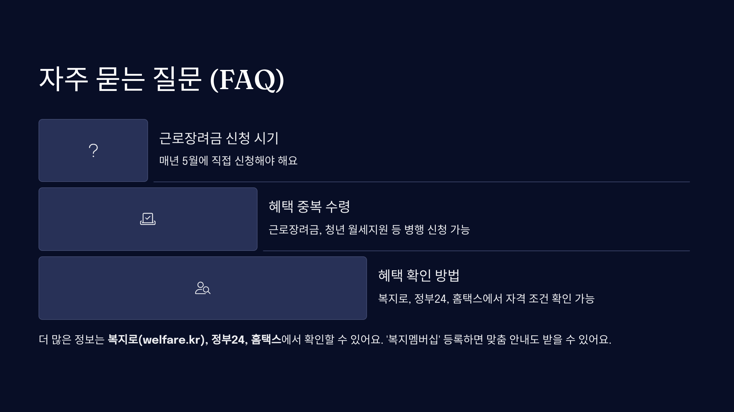 A3. 복지로(welfare.kr), 정부24, 홈택스에서 자격 조건을 확인할 수 있어요. ‘복지멤버십’ 등록하면 맞춤 안내도 받을 수 있어요.