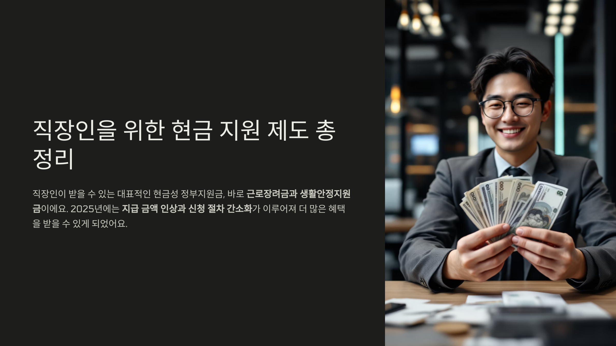 직장인이 받을 수 있는 대표적인 현금성 정부지원금, 바로 근로장려금과 생활안정지원금이에요. 근로소득이 있지만 상대적으로 소득이 낮은 직장인을 위해 마련된, 말 그대로 ‘일하는 사람을 위한 복지’랍니다.