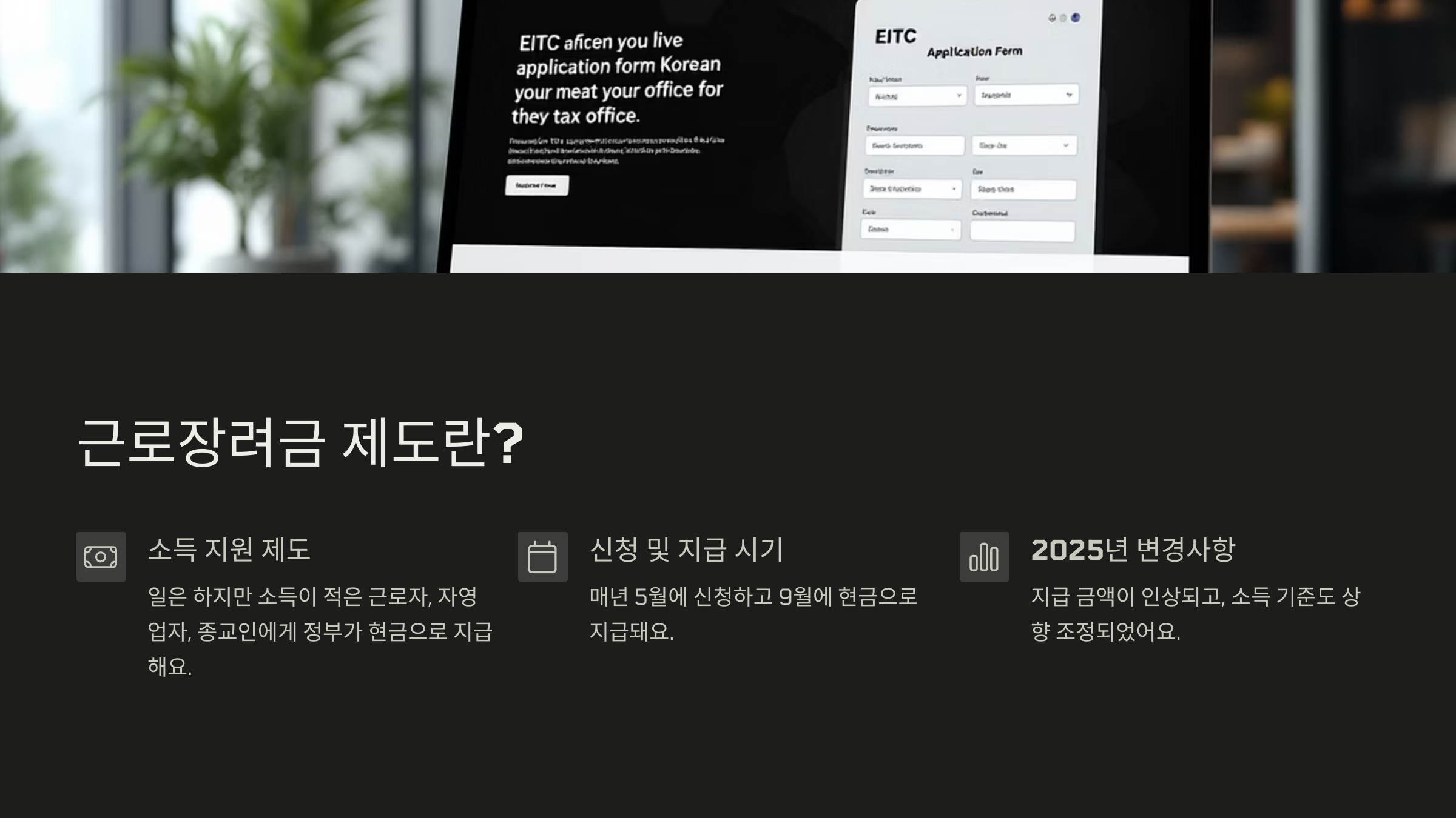 💵 근로장려금(EITC)은 일은 하지만 소득이 적은 근로자, 자영업자, 종교인에게 정부가 현금으로 지급하는 대표적인 소득 지원 제도예요. 쉽게 말해, ‘열심히 일하는 저소득층을 위한 보상’이죠.