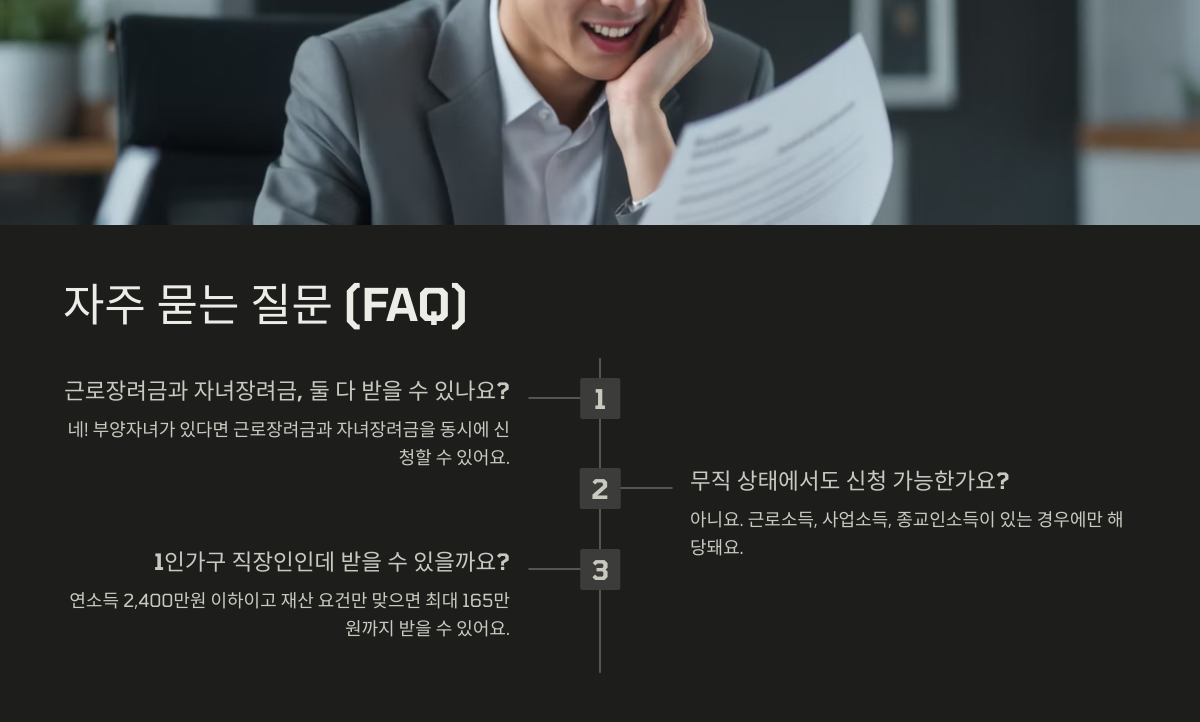 A1. 네! 부양자녀가 있다면 근로장려금과 자녀장려금을 동시에 신청할 수 있어요. 하나의 신청서로 통합 제출돼요.