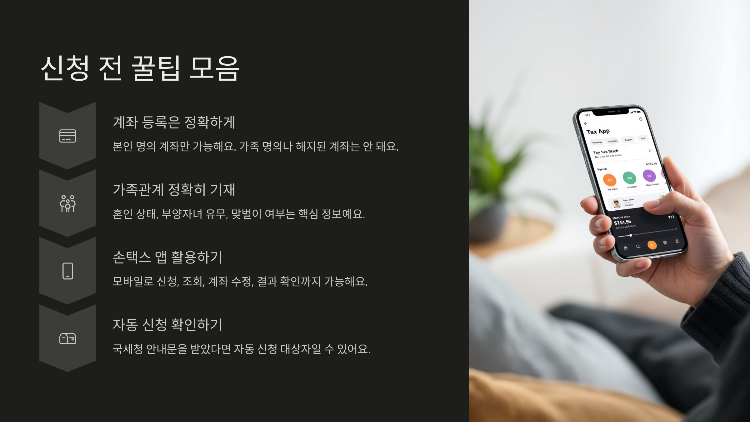 신청 절차는 아주 간단해요. 매년 5월, 국세청 홈택스 또는 손택스 앱을 통해 로그인하면 본인의 신청 대상 여부가 자동으로 나와요. “당신은 신청 대상입니다”라는 안내문이 뜨면 바로 진행하면 돼요.