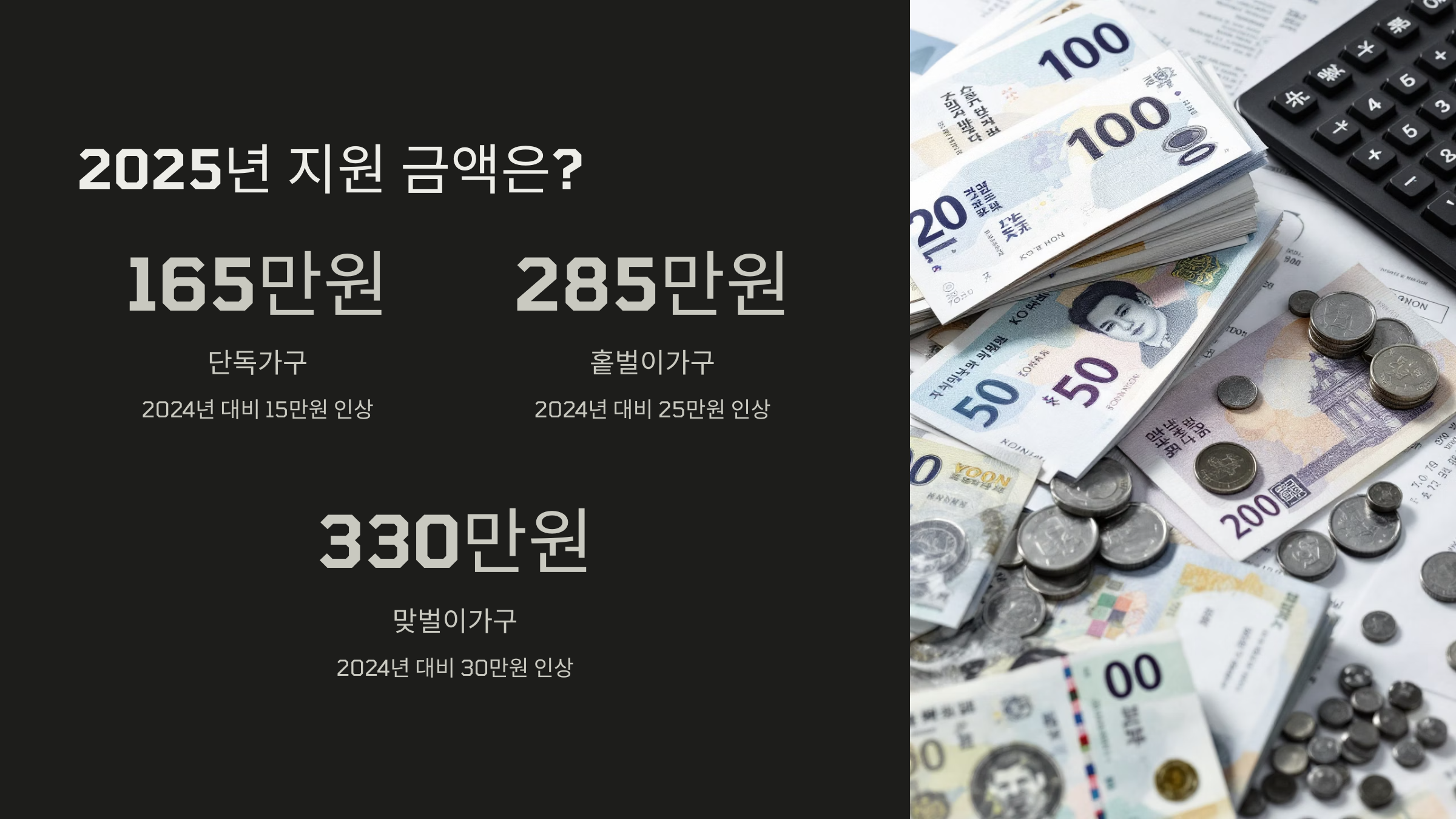 2025년부터는 지급 금액이 인상되고, 소득 기준도 상향 조정되어 더 많은 직장인들이 수급 대상에 포함될 예정이에요. 특히 단독가구 기준이 넓어졌다는 점이 포인트예요.