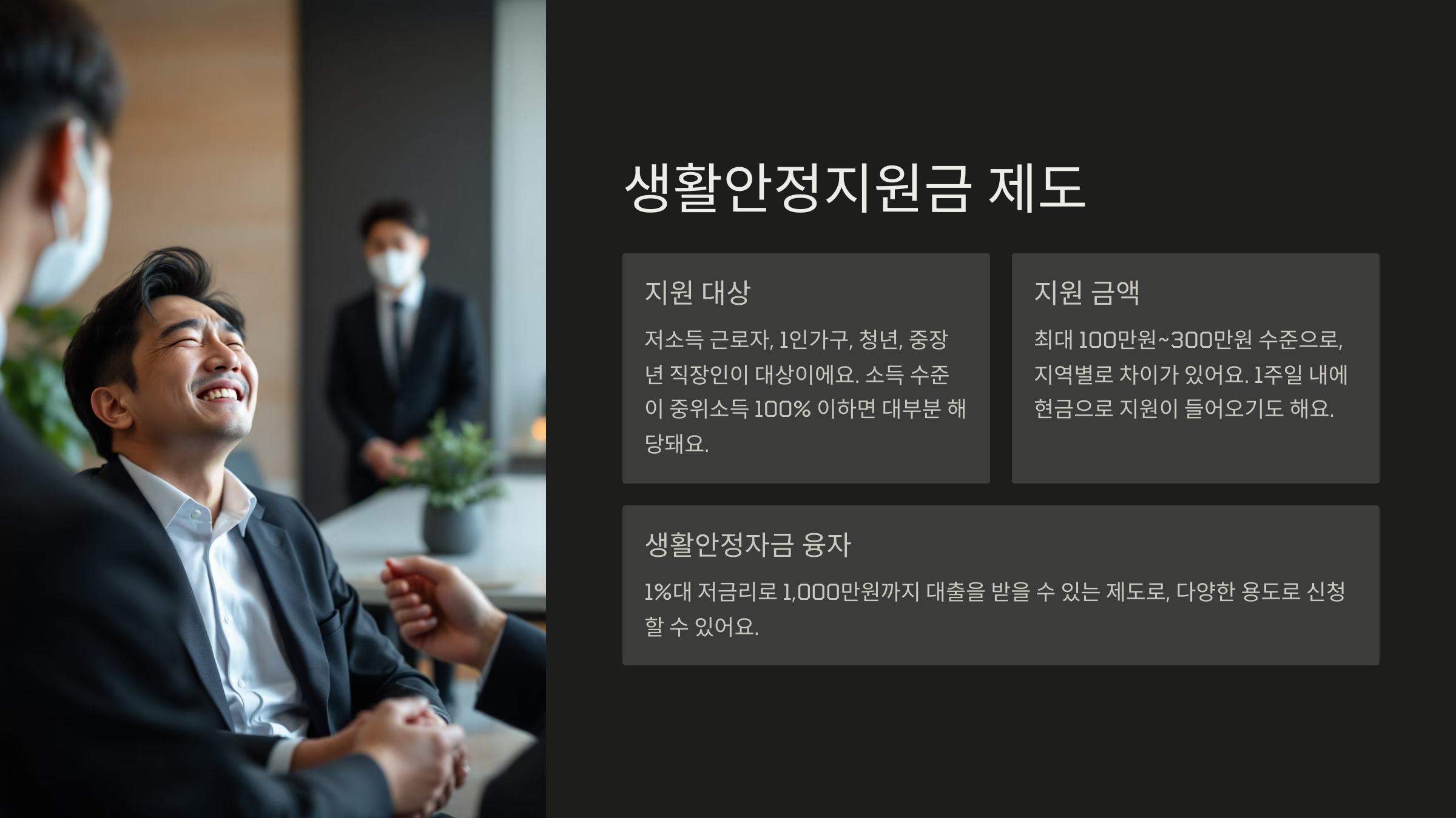 🛟 근로장려금처럼 연간 정기적으로 받는 지원 외에도, 갑작스러운 위기상황에 대응할 수 있는 생활안정지원금 제도가 있어요. 실직, 질병, 사고, 가족 위기 등으로 일시적인 생활비가 급할 때 사용할 수 있죠.