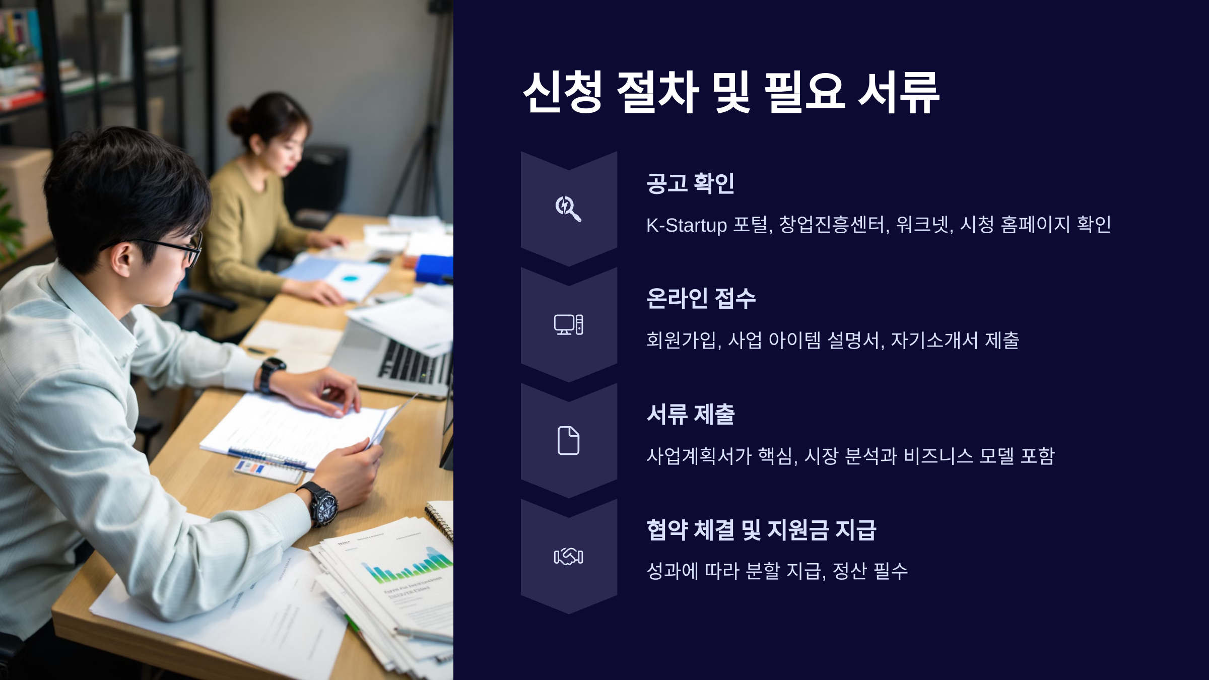 공고는 ‘K-Startup’ 포털, 각 지방의 창업진흥센터, 고용노동부 워크넷, 시청 홈페이지 등에 올라와요. 공고문을 꼼꼼히 읽고, 신청 자격에 해당되면 바로 온라인 접수로 넘어가면 돼요. 이때 필요한 건 회원가입, 사업 아이템 설명서, 간단한 자기소개서 정도예요.