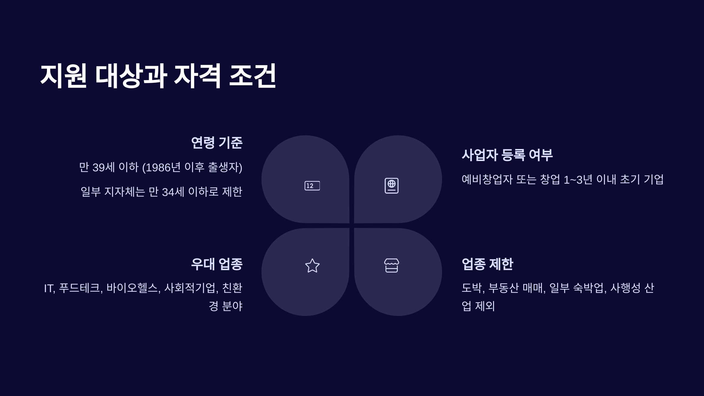 지원 대상은 크게 세 가지 조건이 있어요. 첫 번째는 연령 기준이고, 두 번째는 ‘사업자 등록 여부’예요. 대부분의 초기 창업 지원금은 예비창업자(사업자 등록 전) 또는 창업 1~3년 이내의 초기 기업을 대상으로 해요. 세 번째는 업종 제한이에요. 도박, 부동산 매매, 숙박업 중 일부, 사행성 산업 등은 거의 대부분 제외돼요.