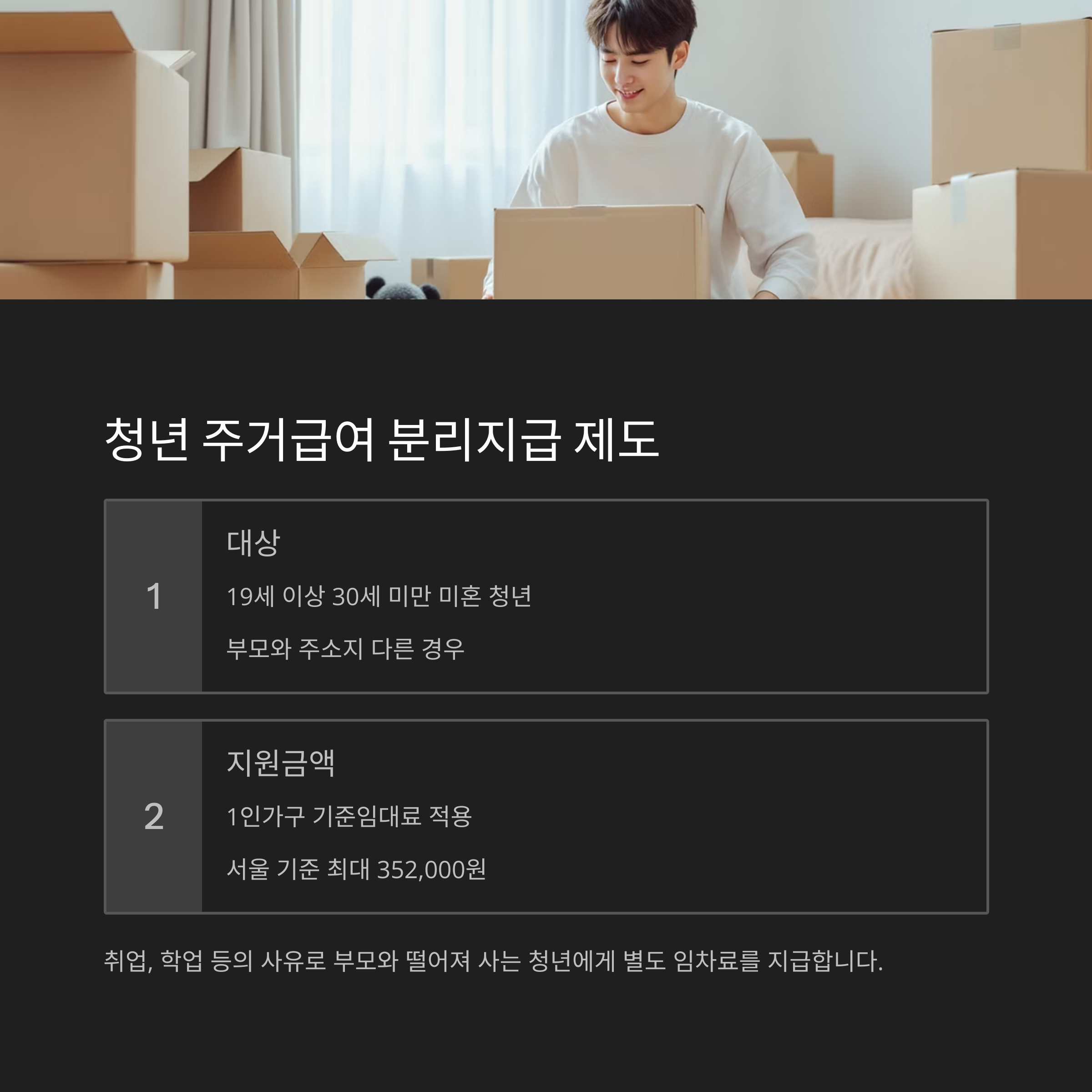 2025년 청년 주거급여 분리지급 제도는 19세 이상 30세 미만의 미혼 청년이 주거급여 수급가구의 구성원이면서 부모와 거주지를 달리하는 경우 별도의 임차료를 지급받을 수 있는 제도에요. 이는 청년들의 독립적인 주거 생활을 지원하고, 취업이나 학업을 위해 부모와 떨어져 살아야 하는 청년들의 주거비 부담을 덜어주기 위한 정책입니다. 특히 대학 진학이나 취업을 위해 타지역으로 이주하는 청년들에게 실질적인 도움이 되고 있어요.