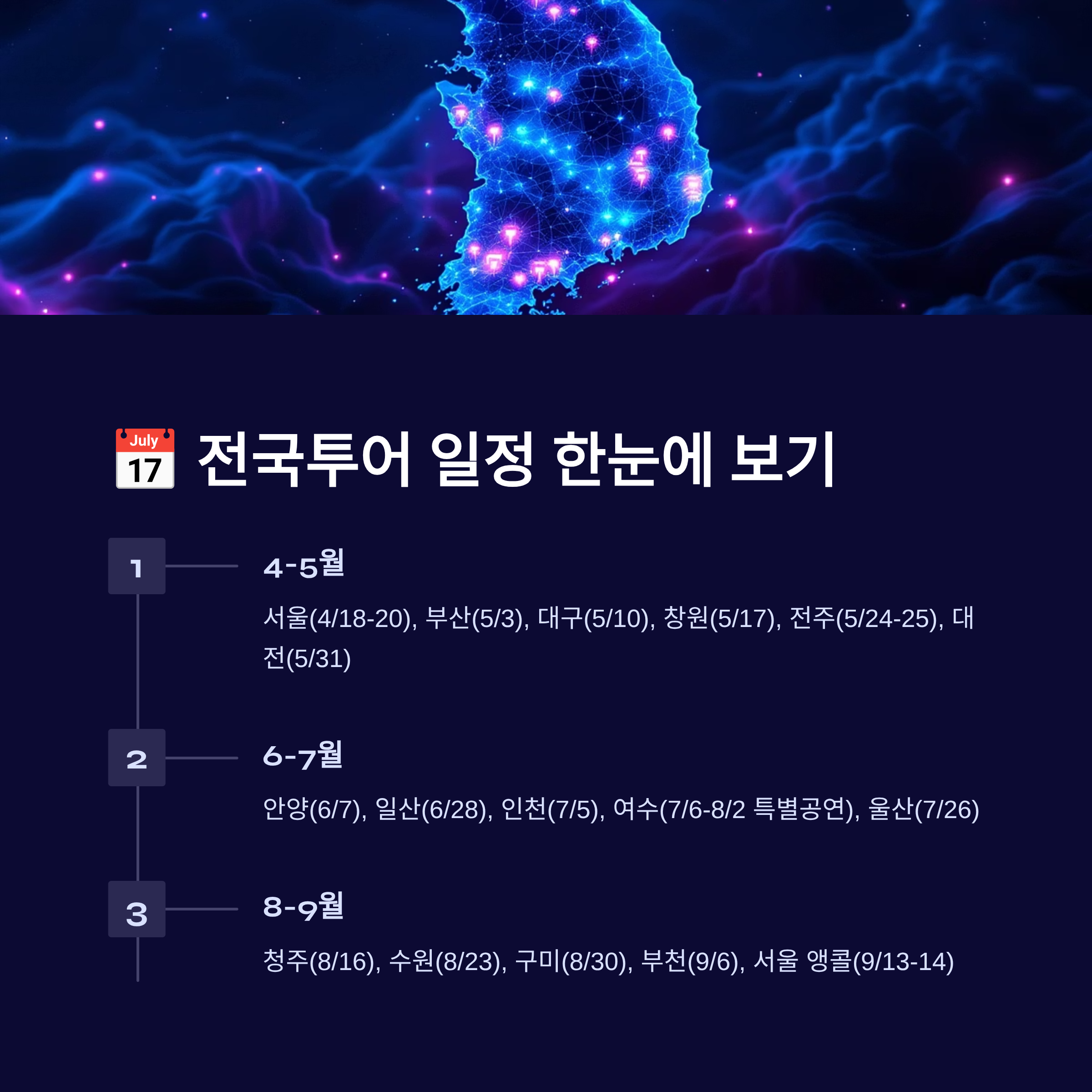 서울 공연은 4월 18일부터 20일까지 잠실실내체육관에서 열렸고, 9월 13일과 14일에는 고려대학교 화정체육관에서 앵콜 공연이 예정되어 있어요. 부산은 5월 3일 벡스코에서, 대구는 5월 10일 엑스코 동관에서 공연이 진행돼요.
