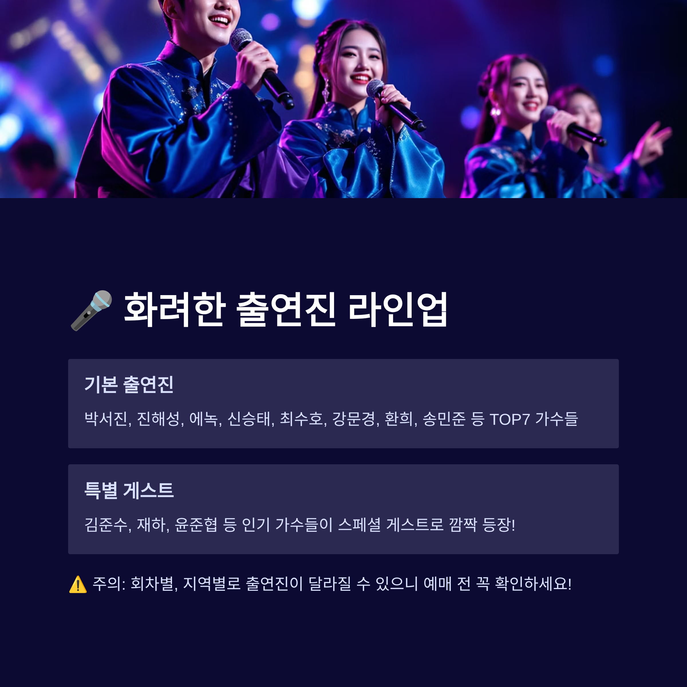 기본 출연진은 박서진, 진해성, 에녹, 신승태(신송태), 최수호, 강문경, 환희, 송민준 등 8명이에요. 하지만 주의할 점은 회차별, 지역별로 출연진이 조금씩 달라진다는 거예요. 예를 들어 서울 4월 18일 공연과 4월 19일 공연의 라인업이 다를 수 있어요.