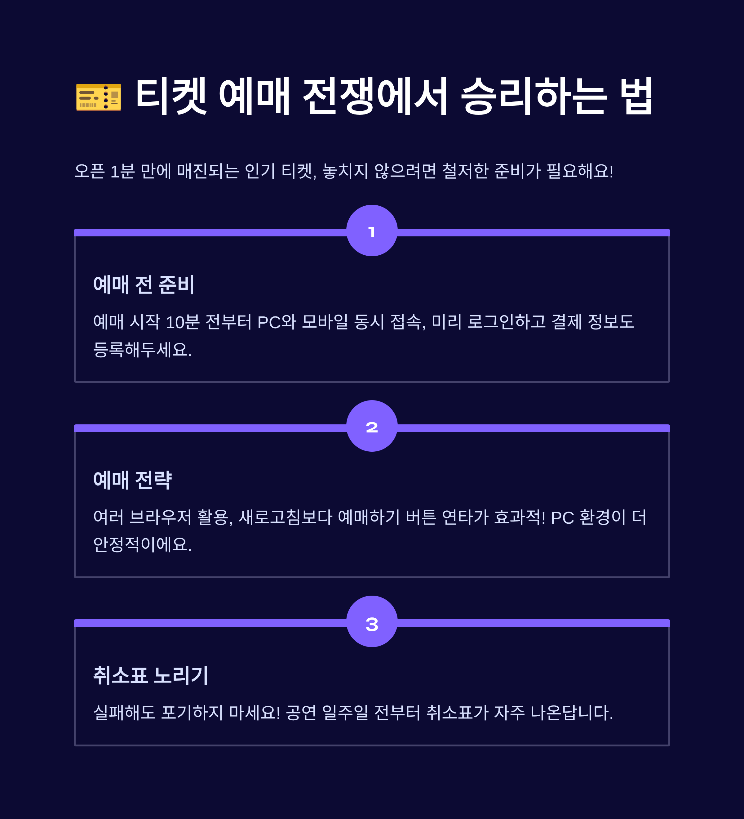 예매 성공률을 높이려면 철저한 준비가 필요해요. 예매 시작 10분 전부터 PC와 모바일을 동시에 켜두고, 미리 로그인해서 대기하세요. 결제 정보도 미리 등록해두면 좋아요. 여러 브라우저를 동시에 활용하고, 새로고침보다는 예매하기 버튼을 계속 클릭하는 방식이 더 효과적이에요!