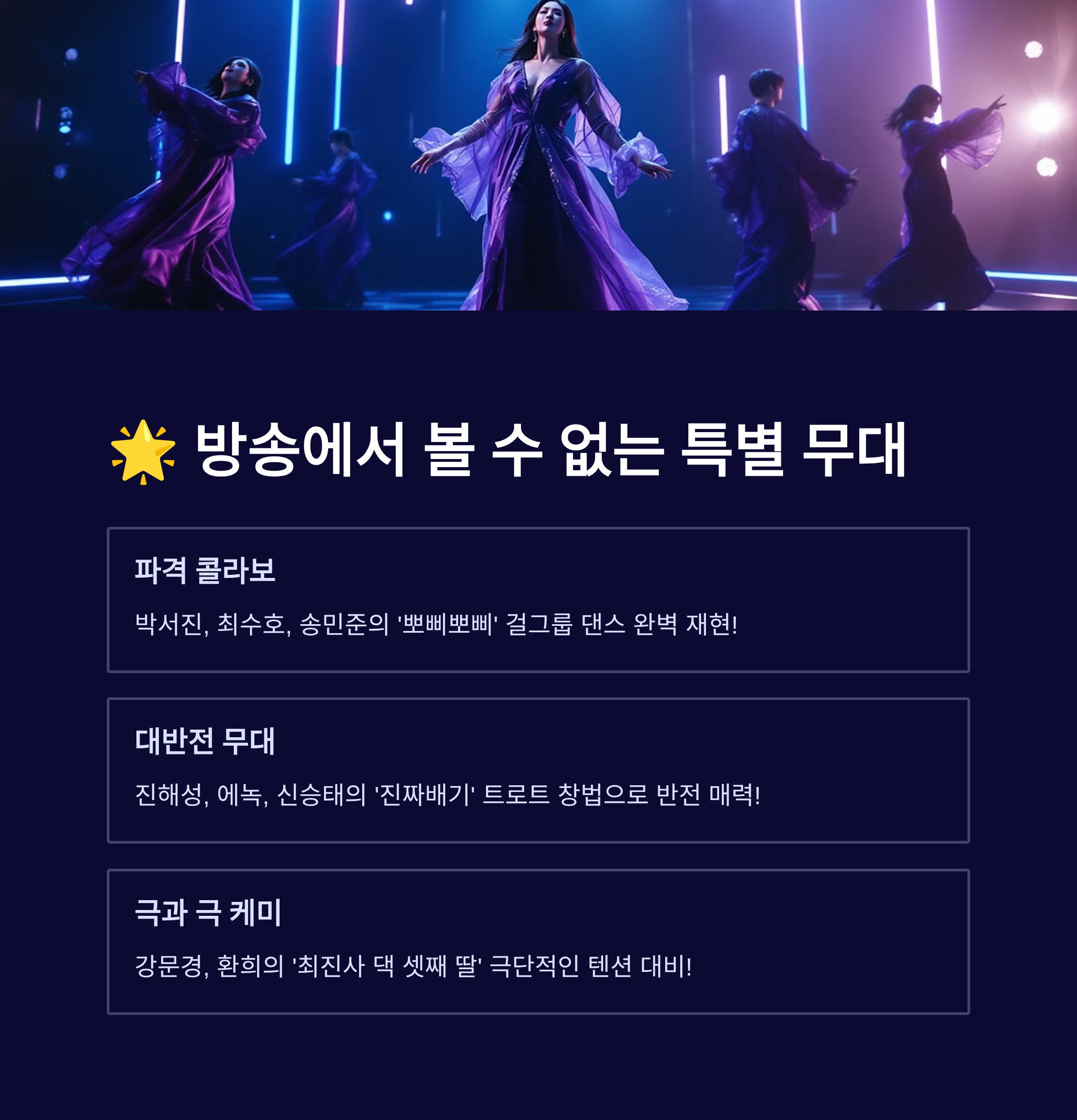 박서진, 최수호, 송민준이 티아라의 '뽀삐뽀삐'를 걸그룹 댄스로 선보인다니 상상이 되시나요? 진해성, 에녹, 신승태는 이명화의 '진짜배기'로 대반전 무대를 준비했고, 강문경과 환희는 '최진사 댁 셋째 딸'로 극과 극의 텐션을 보여준대요!