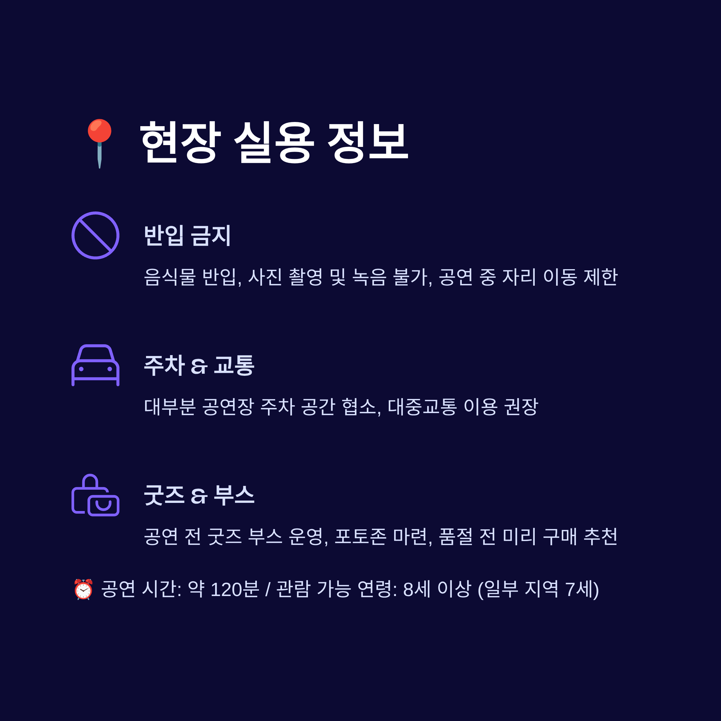 콘서트장에 가기 전에 꼭 알아두어야 할 실용 정보들을 정리했어요! 먼저 공연장 내 음식물 반입은 금지되어 있고, 촬영과 녹음도 불가능해요. 📵