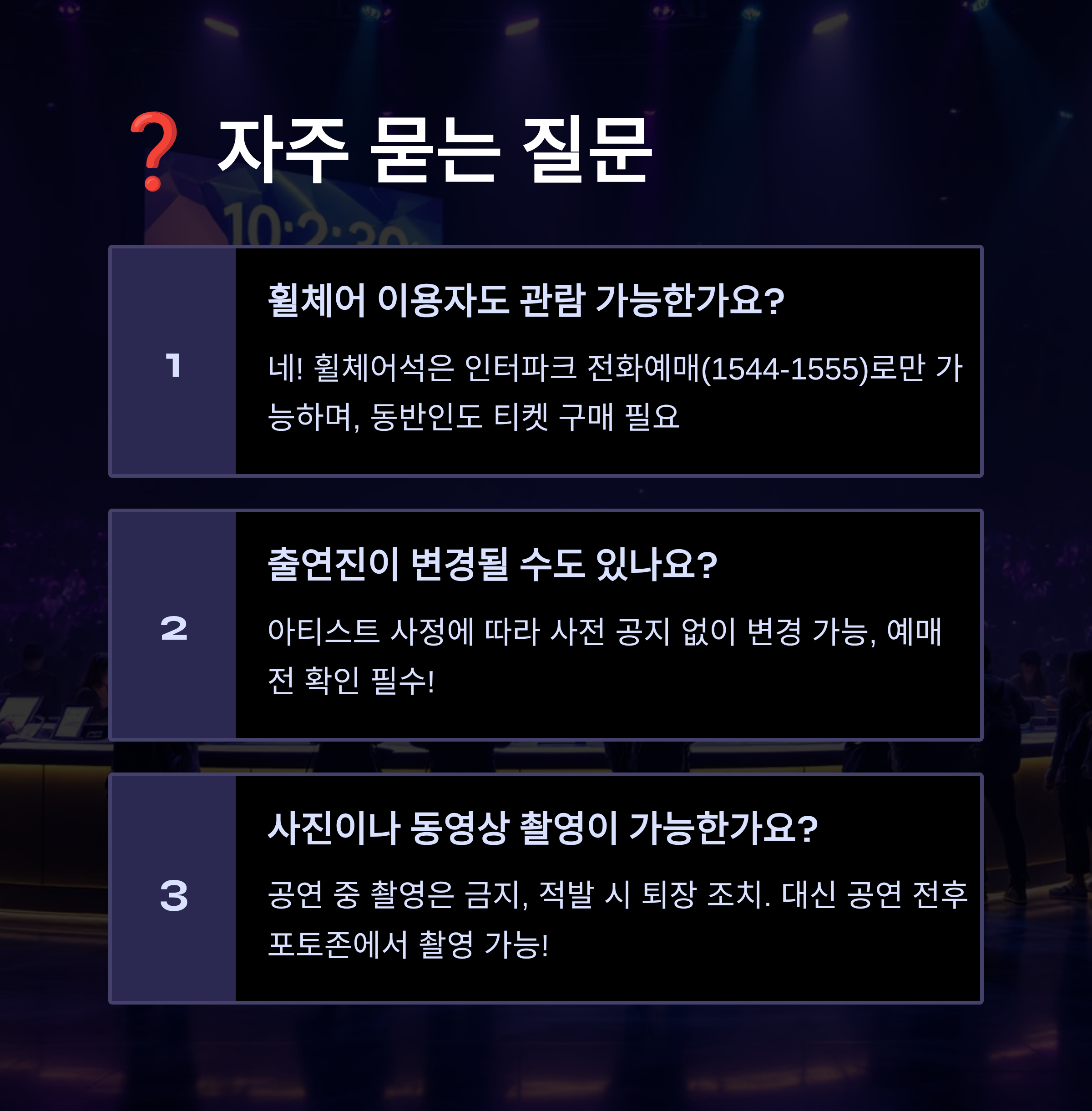 회차별 출연진 정보는 예매 페이지에서 반드시 확인하세요. 좋아하는 가수가 출연하는 날짜를 놓치면 너무 아쉬울 거예요! 😊