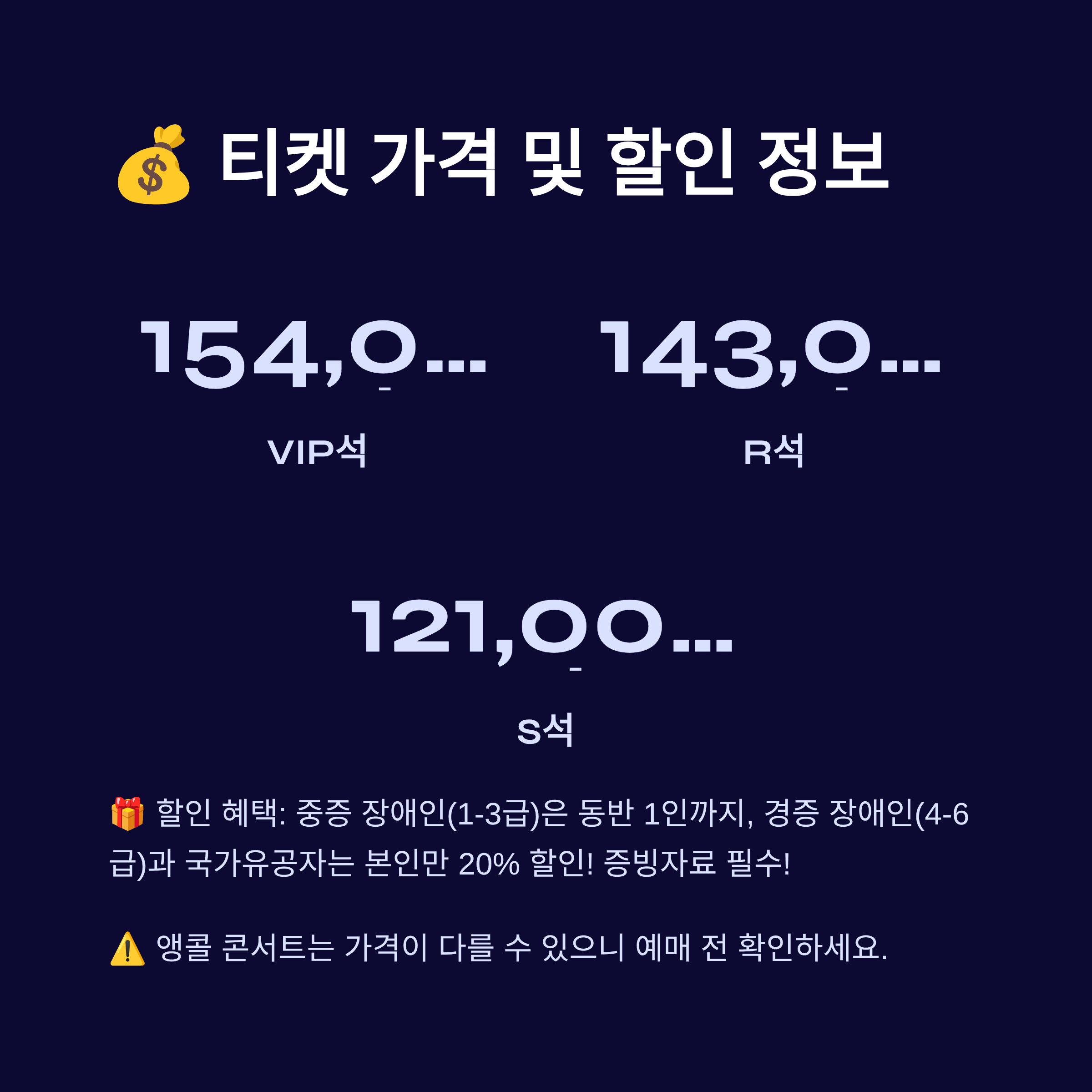 티켓 가격이 부담스러울 수 있지만, 120분 동안 펼쳐지는 감동적인 무대를 생각하면 충분히 가치 있는 투자라고 생각해요. 특히 좋아하는 가수를 가까이에서 볼 수 있는 기회는 흔치 않으니까요! 🎶