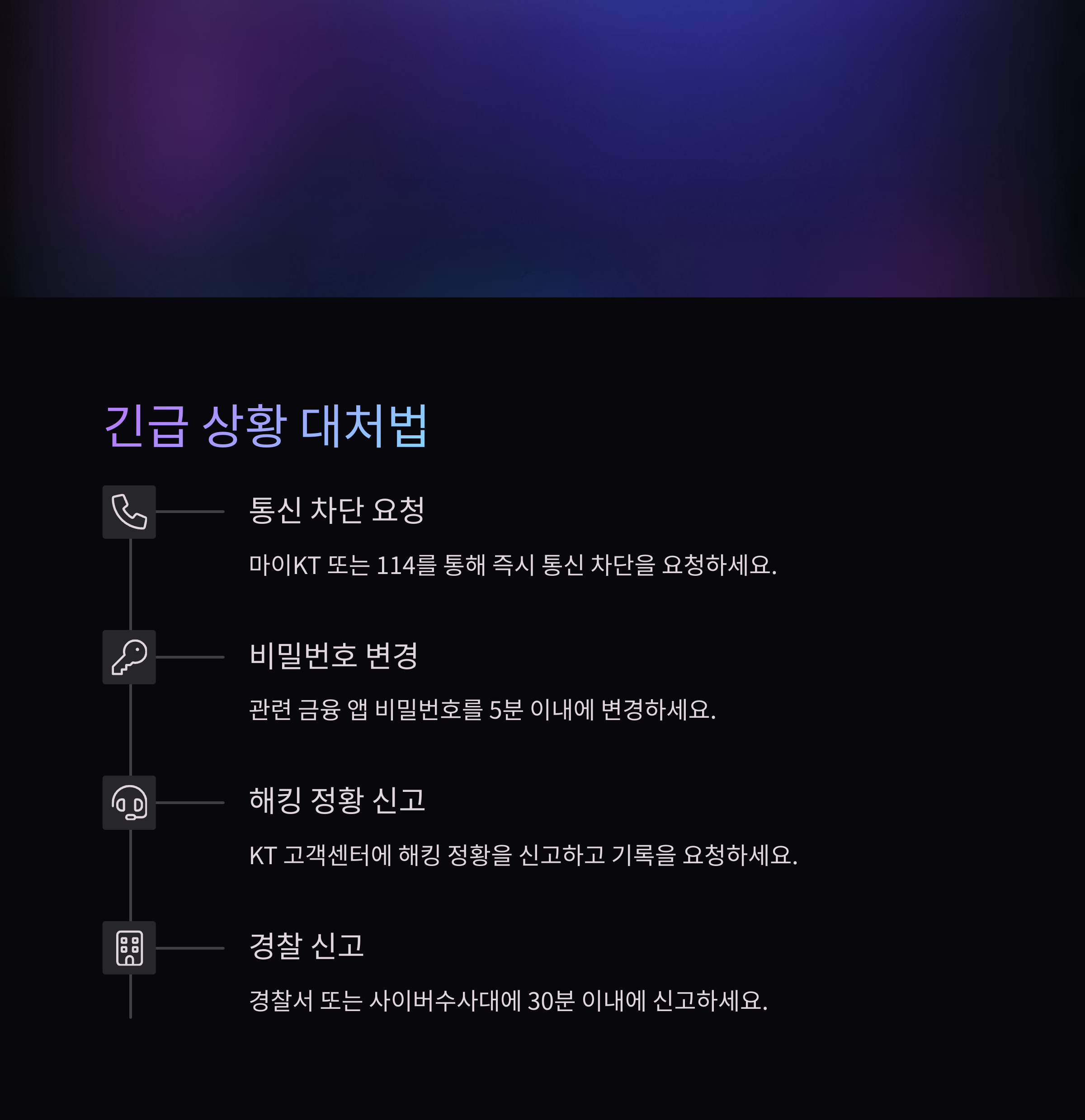 | 3단계 | KT 고객센터에 해킹 정황 신고 및 기록 요청 | 10분 이내 |