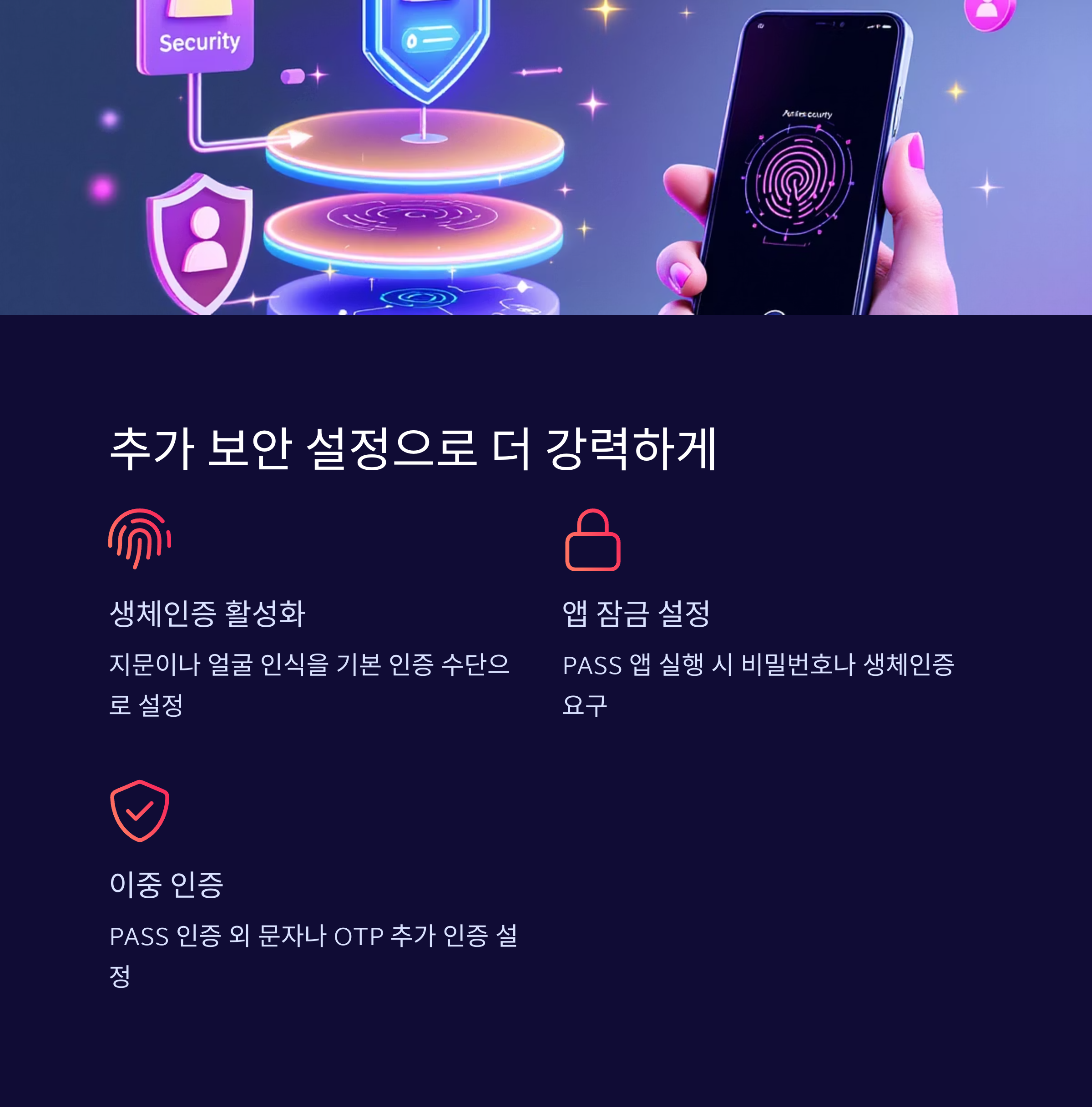 | 생체인증 사용 | 매우 추천 | PASS 앱 > 보안 설정 |