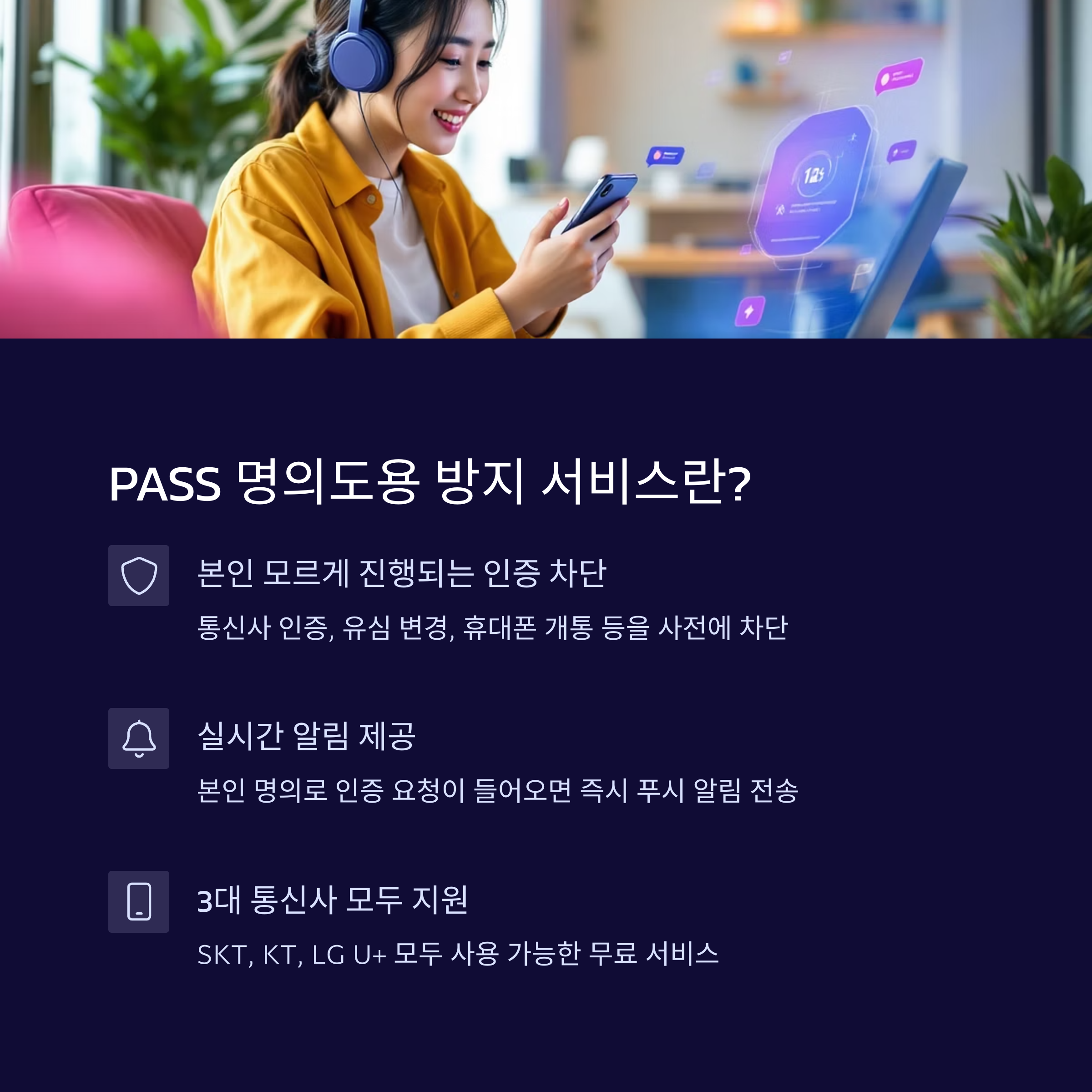 대표적으로 이 서비스는 본인 인증, 유심 변경, 휴대폰 개통 요청, 통신서비스 변경 시도를 차단할 수 있어요. 누군가 내 명의로 핸드폰 개통을 시도한다면? PASS 앱에서 바로 알림이 오고, 내가 직접 승인하지 않으면 진행이 되지 않아요.