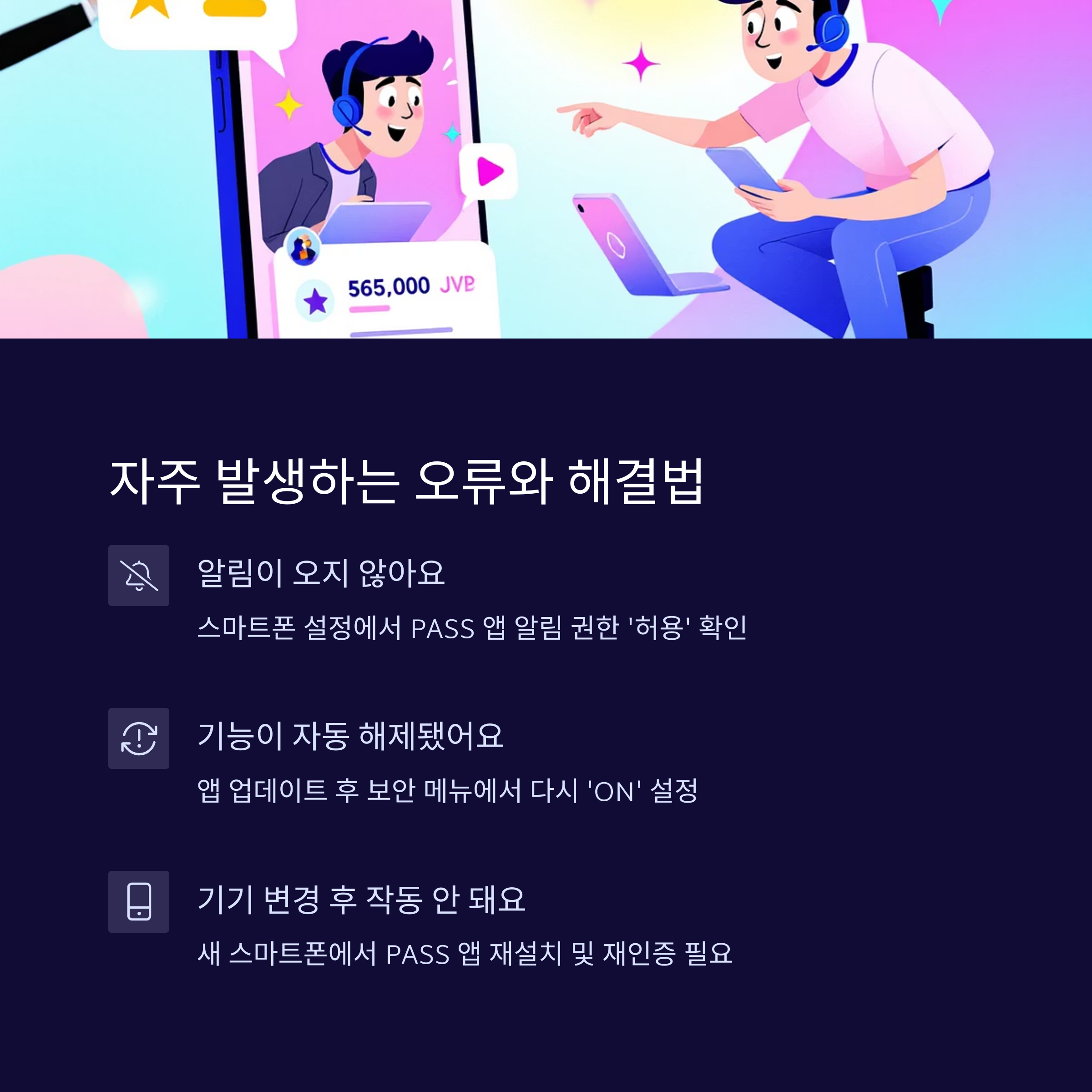 A3. 스마트폰 설정에서 PASS 앱의 알림 권한이 꺼져 있는지 확인해보세요. 대부분 알림 허용을 다시 설정하면 정상 작동돼요.