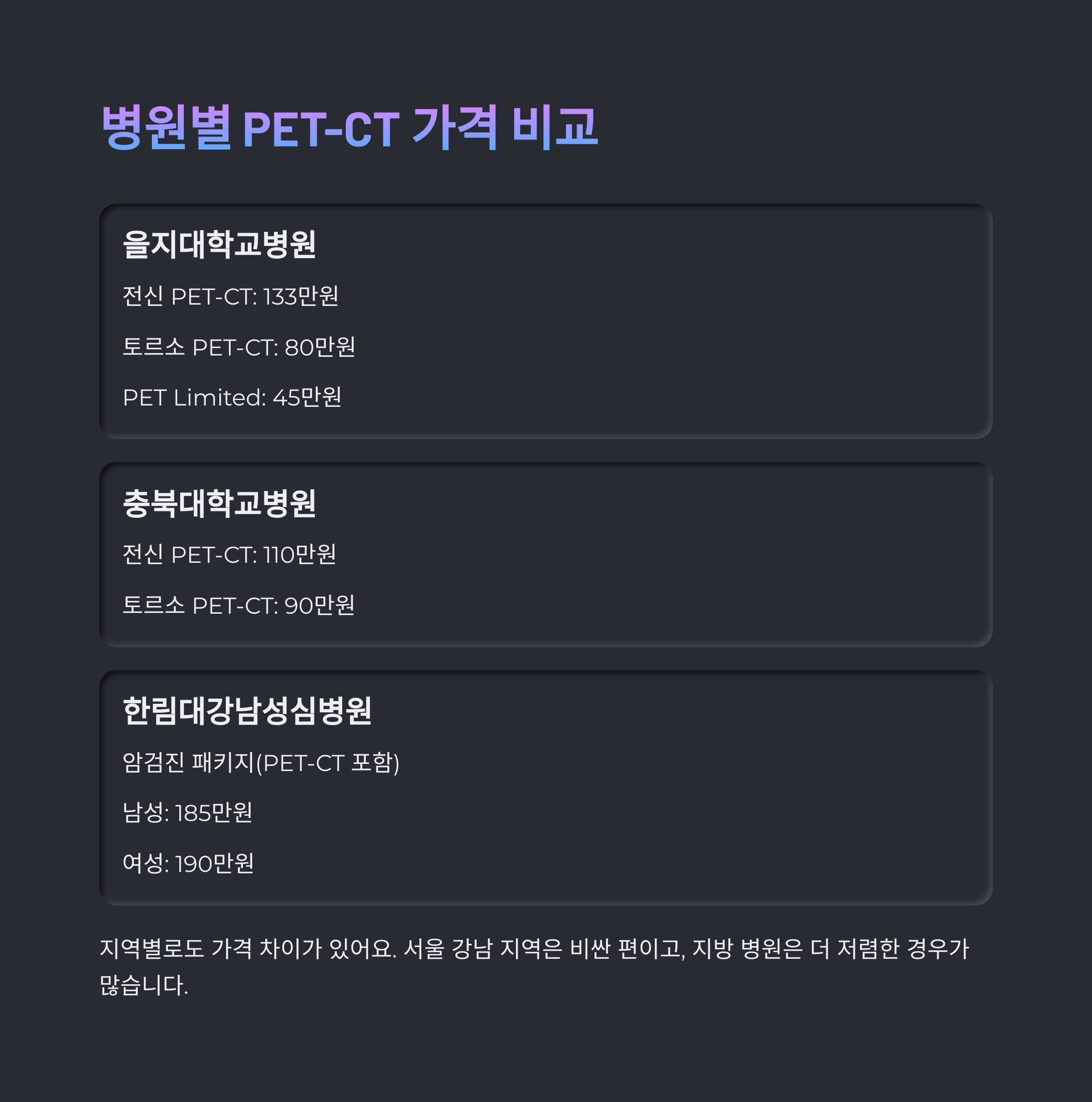 을지대학교병원의 경우 전신 PET-CT가 133만원, 토르소 PET-CT는 80만원으로 책정되어 있어요. 암 검진 목적의 PET Limited는 45만원으로 상대적으로 저렴한 편이죠. 충북대학교병원은 토르소 90만원, 전신 110만원으로 운영하고 있어요. 💰