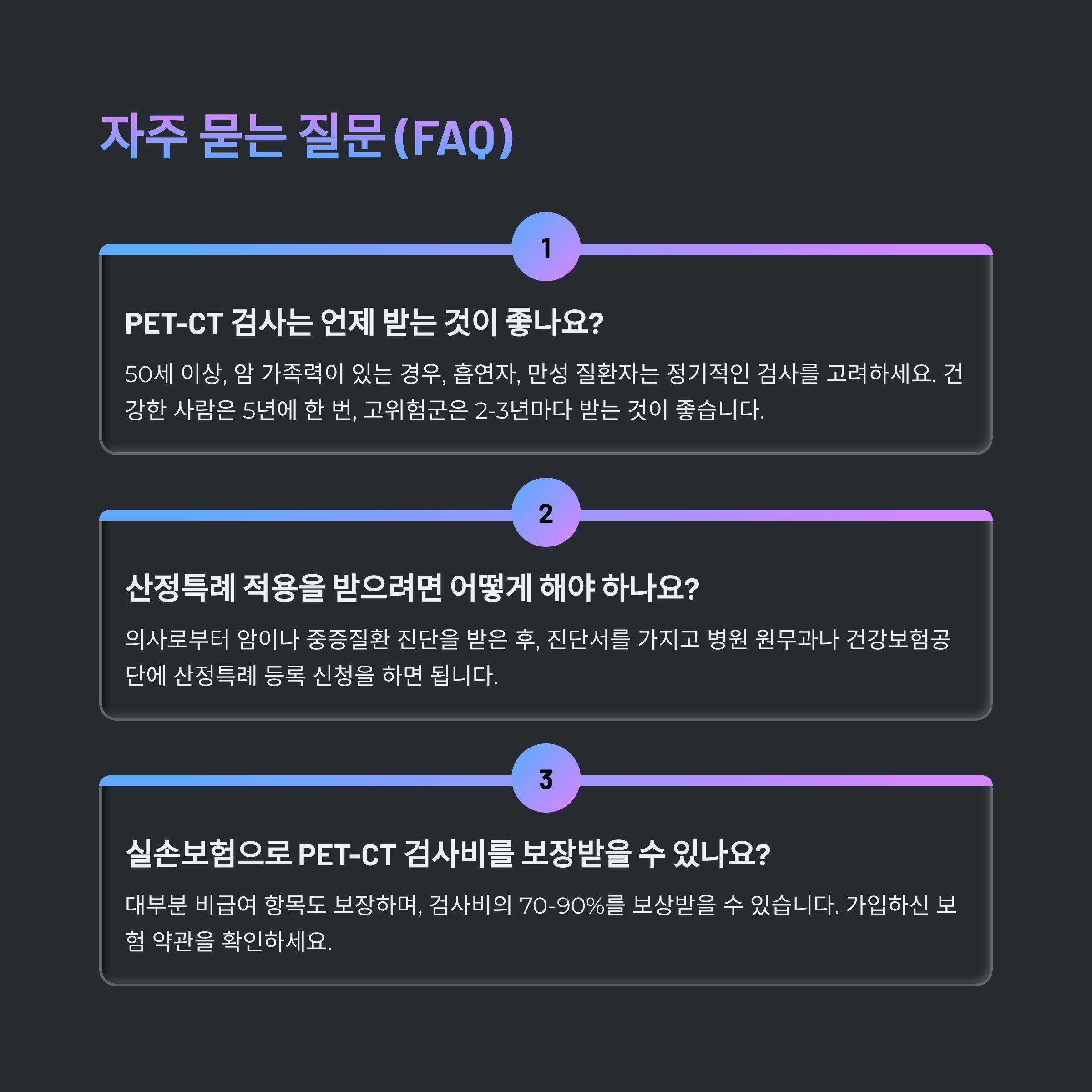 최근에는 암보험에서도 PET-CT 검사비를 특약으로 보장하는 상품이 늘고 있어요. 암 진단 시 검사비를 별도로 지급하거나, 연간 일정 금액까지 검사비를 보장하는 형태예요. 가족력이 있거나 고위험군에 속한다면 이런 보험 가입도 고려해보세요. 🛡️
