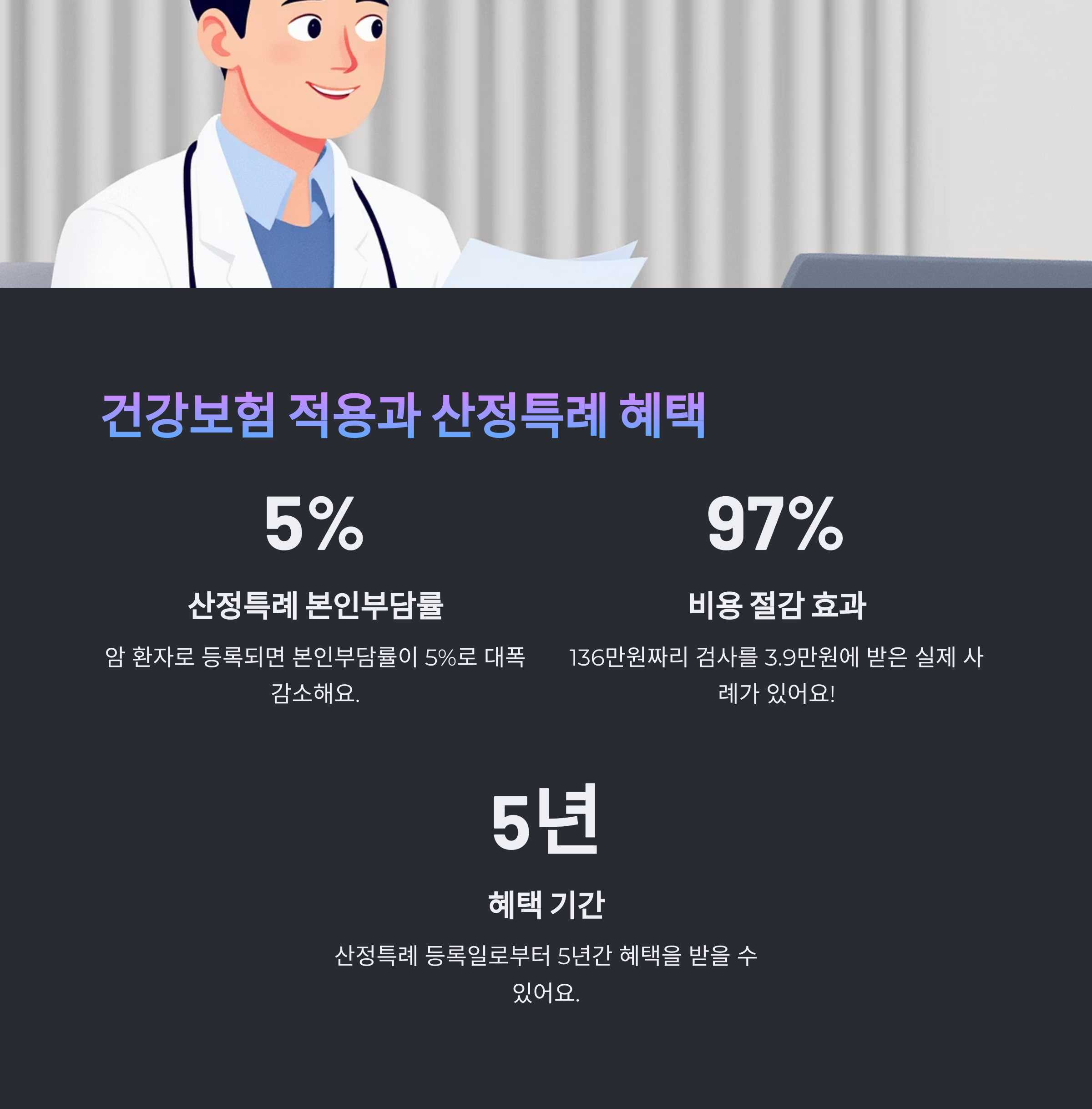 산정특례란 암, 희귀질환 등 중증질환자의 의료비 부담을 줄여주는 제도예요. 암 환자로 등록되면 본인부담률이 5%로 대폭 감소해요. 실제로 136만원짜리 PET-CT 검사를 3만 9천원에 받았다는 사례도 있어요. 이는 무려 97% 할인된 가격이죠! 🎉