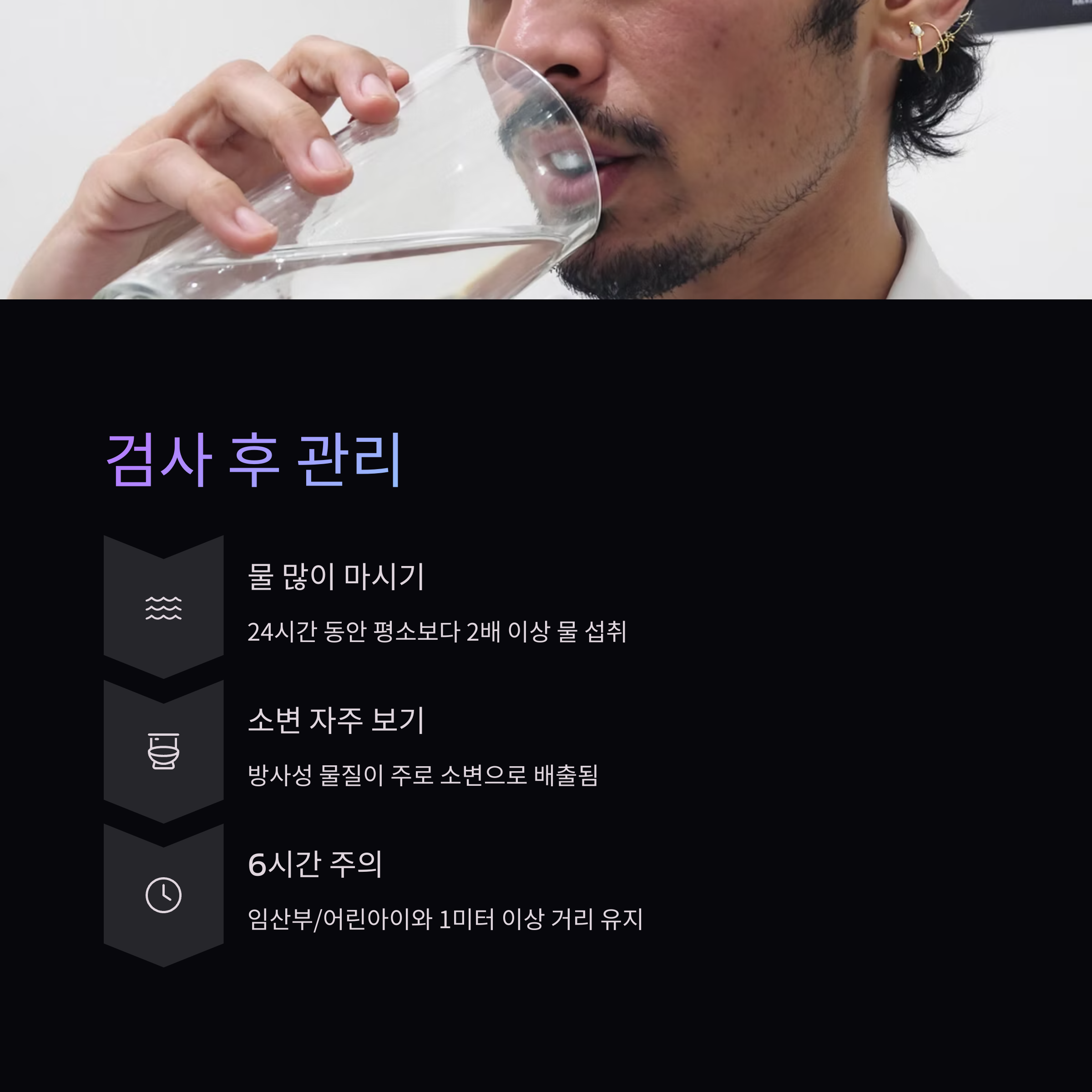 | 방사선 노출 | 검사 후 물 많이 마시기 | 2시간 반감기 설명 듣기 |