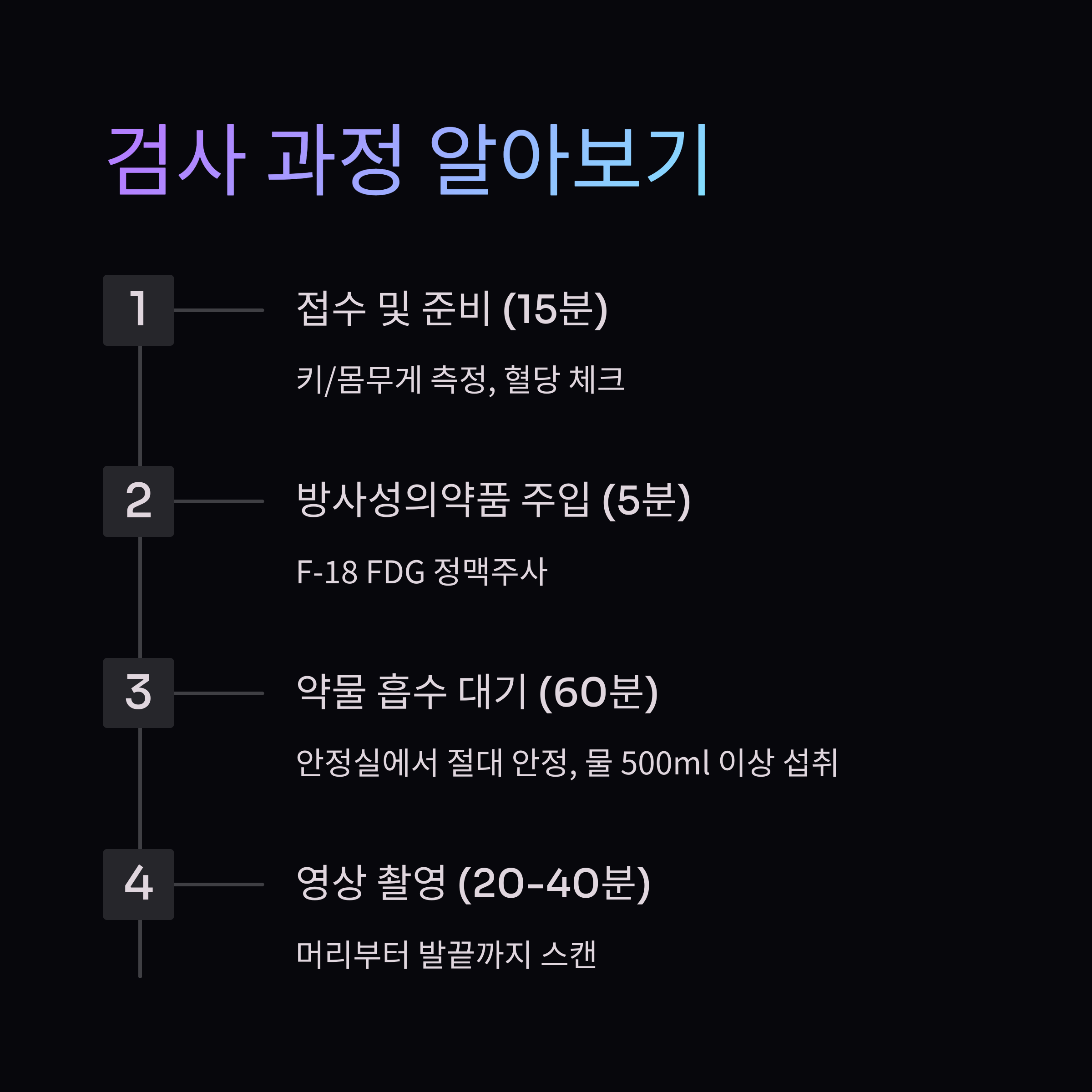 | 방사성의약품 주입 | 5분 | F-18 FDG 정맥주사 |