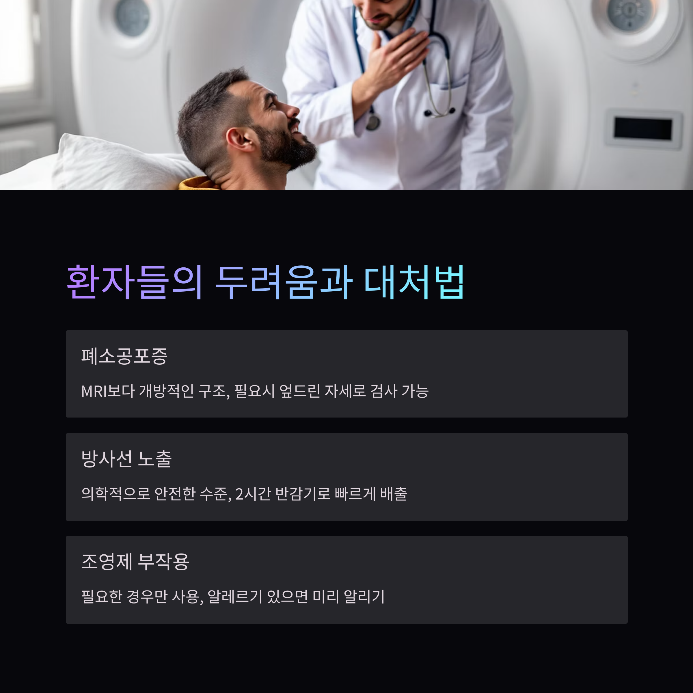 | 폐소공포증 | 엎드린 자세 검사 요청 | 검사 전 진정제 상담 |
