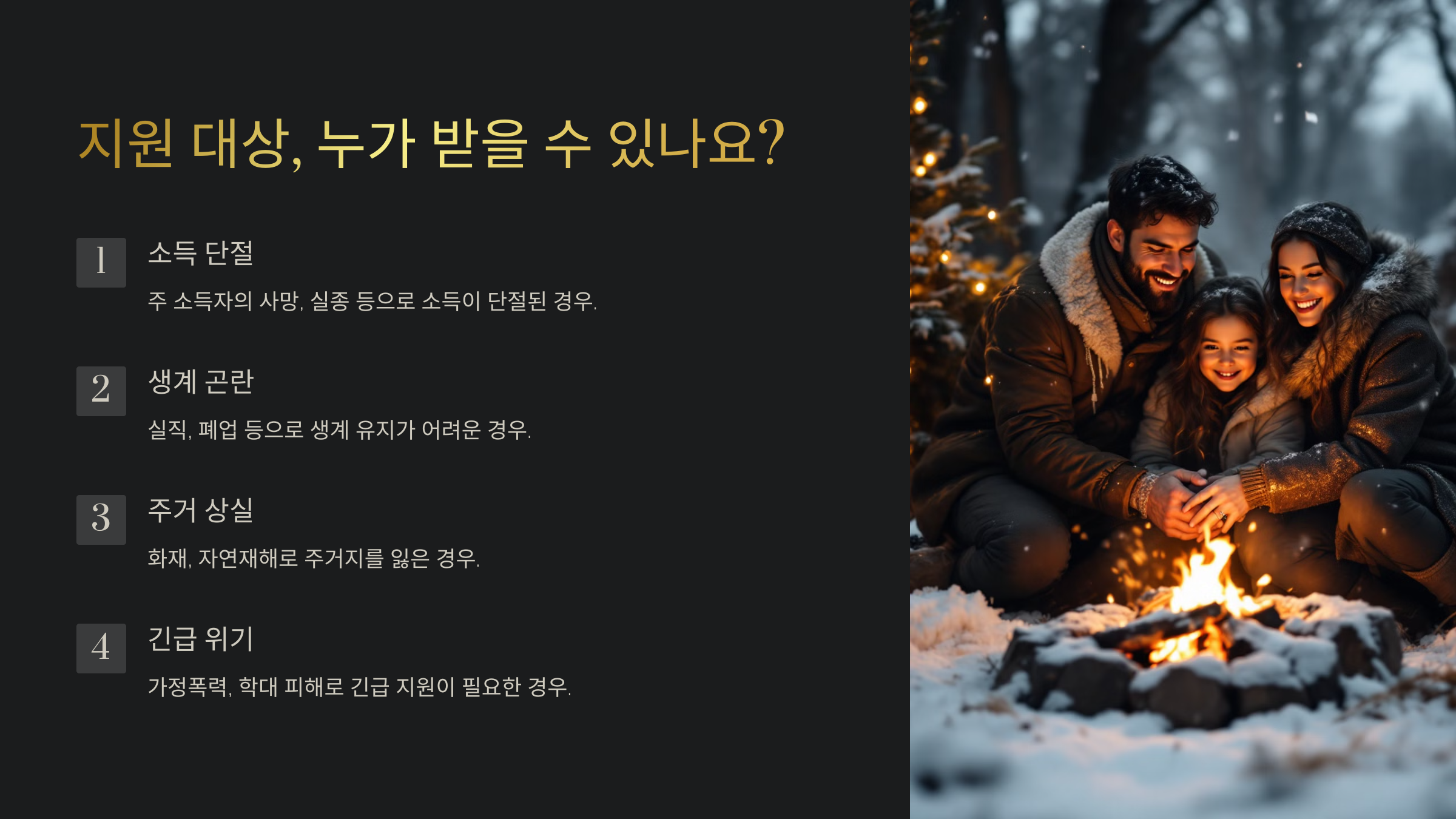 - ✔ 화재, 가정폭력 등으로 인해 긴급한 지원이 필요한 경우
