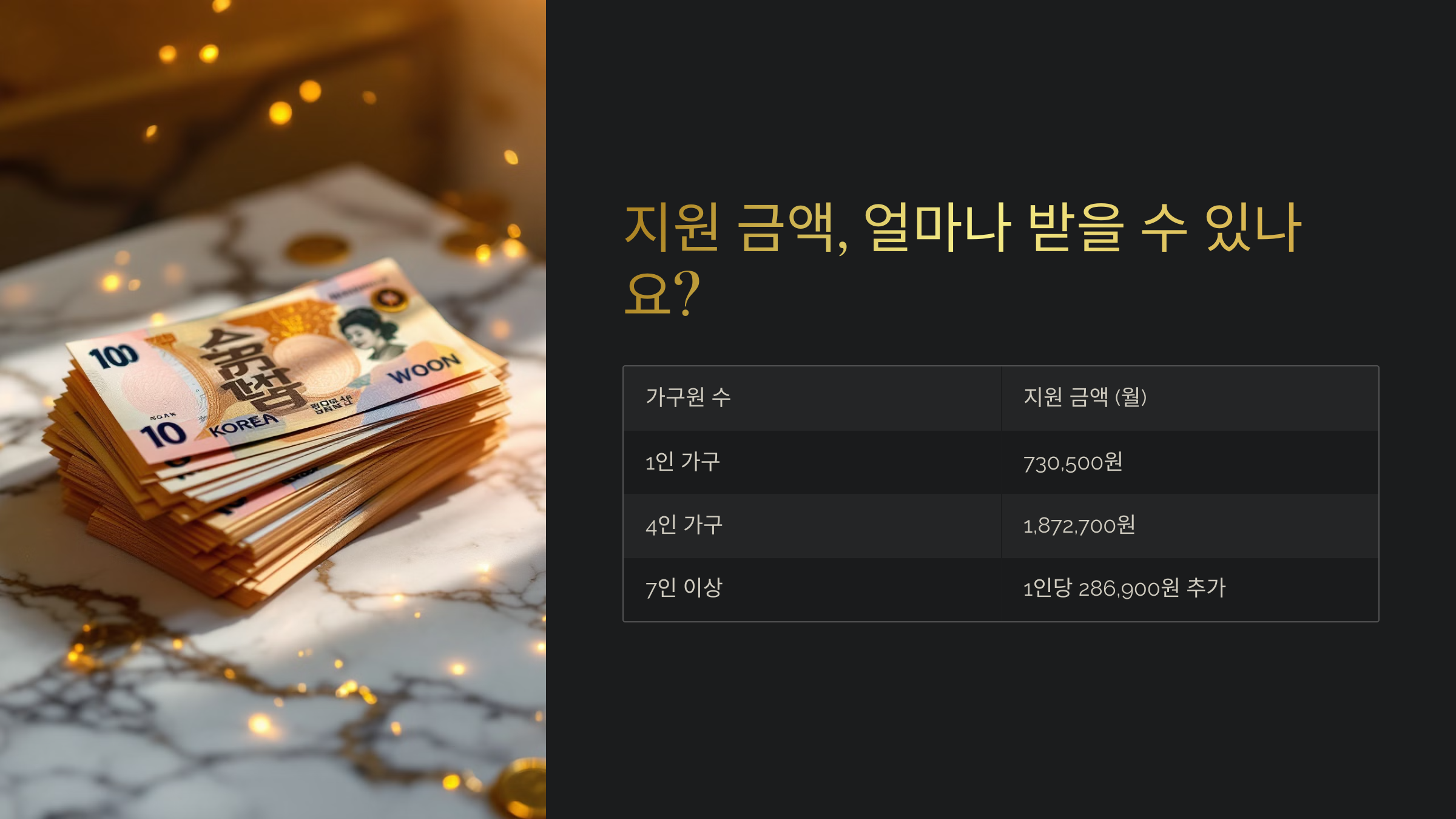 정부는 2024년 기준으로 1인 가구에 730,500원, 4인 가구에 1,872,700원을 지급하며, 7인 이상 가구는 1인당 286,900원이 추가 지원돼요.