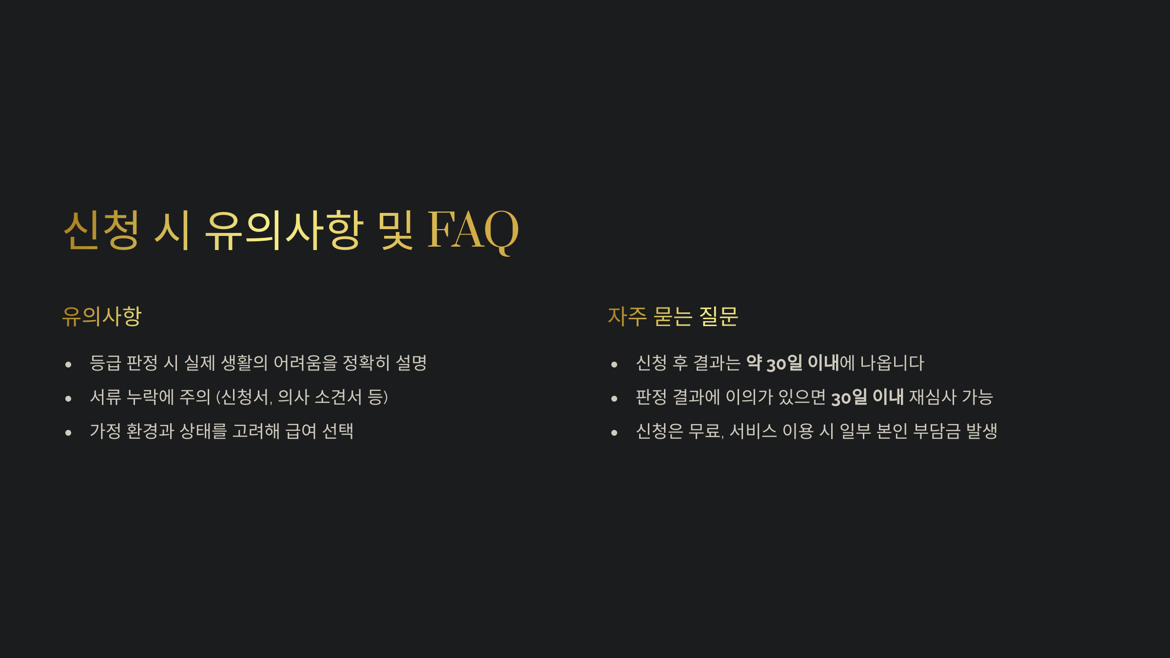 | 등급 판정 준비 | 실제 생활에서의 어려움을 정확히 설명해야 해요. |