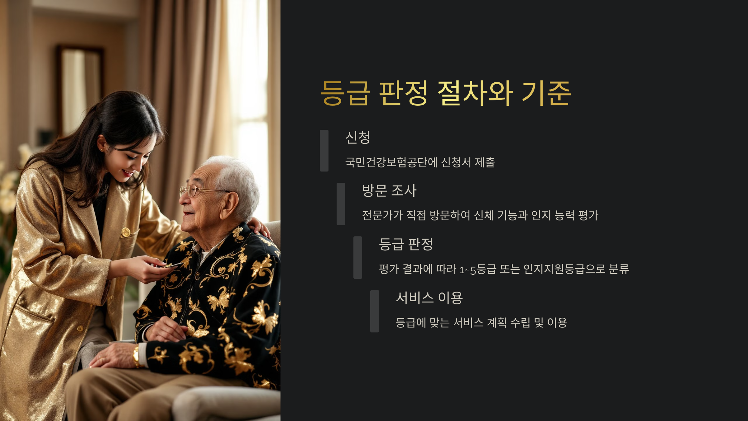 등급 판정은 국민건강보험공단에서 담당하며, 전문가가 직접 방문하여 신청자의 신체 기능과 인지 능력 등을 평가해요. 평가 결과에 따라 1~5등급 또는 인지지원등급으로 나뉘어요.