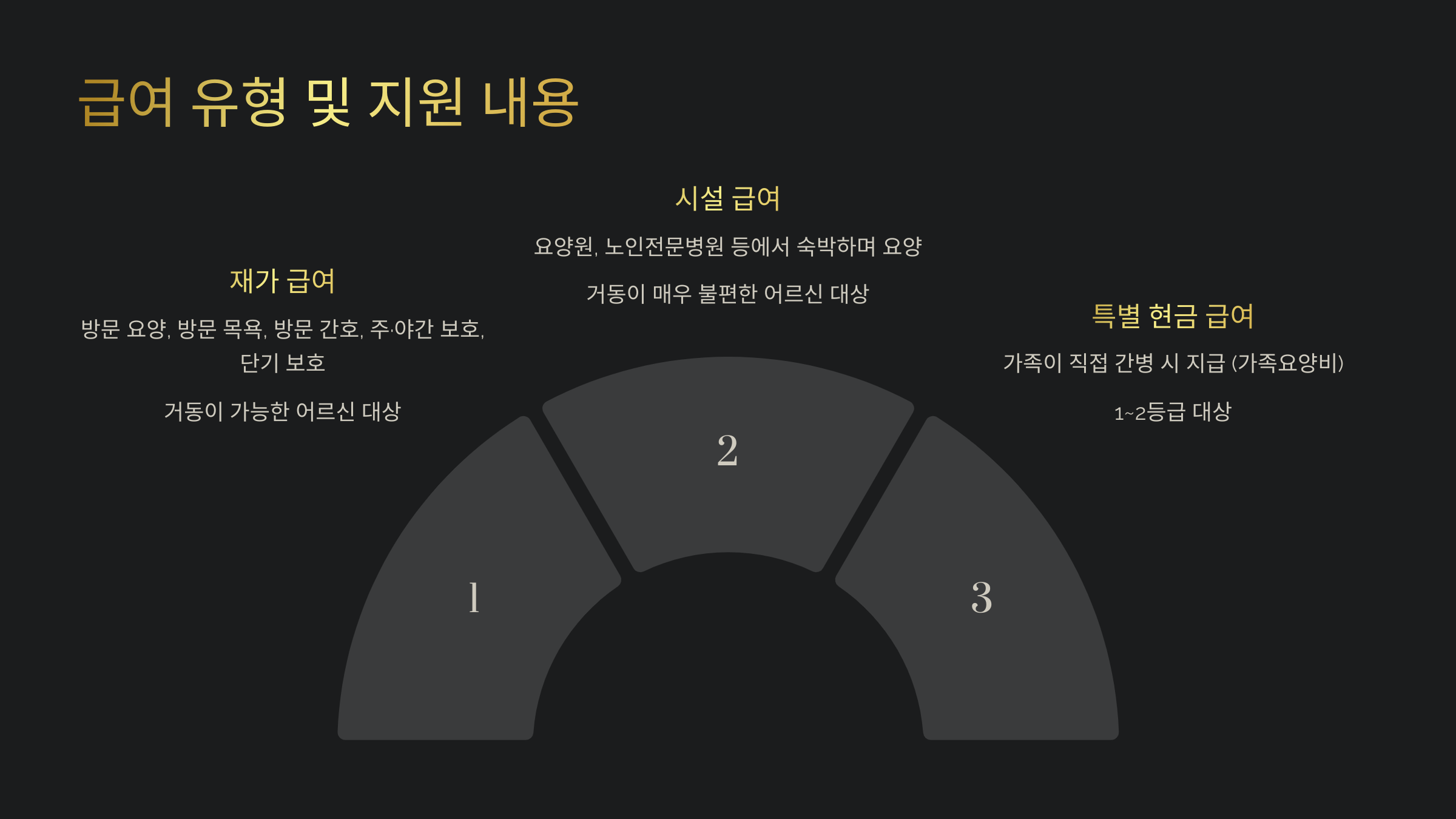 | 특별 현금 급여 | 가족이 직접 간병 시 지급 (가족요양비) | 1~2등급 대상 |