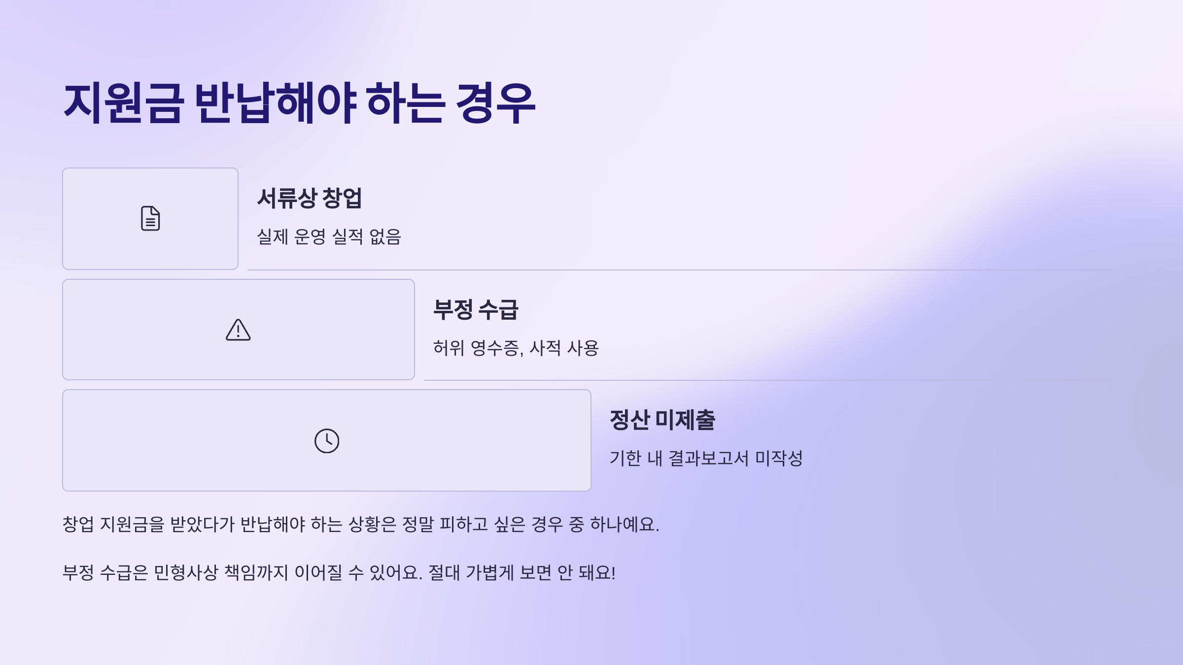 창업 지원금을 받았다가 반납해야 하는 상황은 정말 피하고 싶은 경우 중 하나예요. 하지만 실제로 꽤 많은 창업자들이 ‘의도치 않게’ 이 상황에 처하곤 해요. 그 이유는 단순해요, ‘조건 위반’ 또는 ‘부정 사용’ 때문이에요.